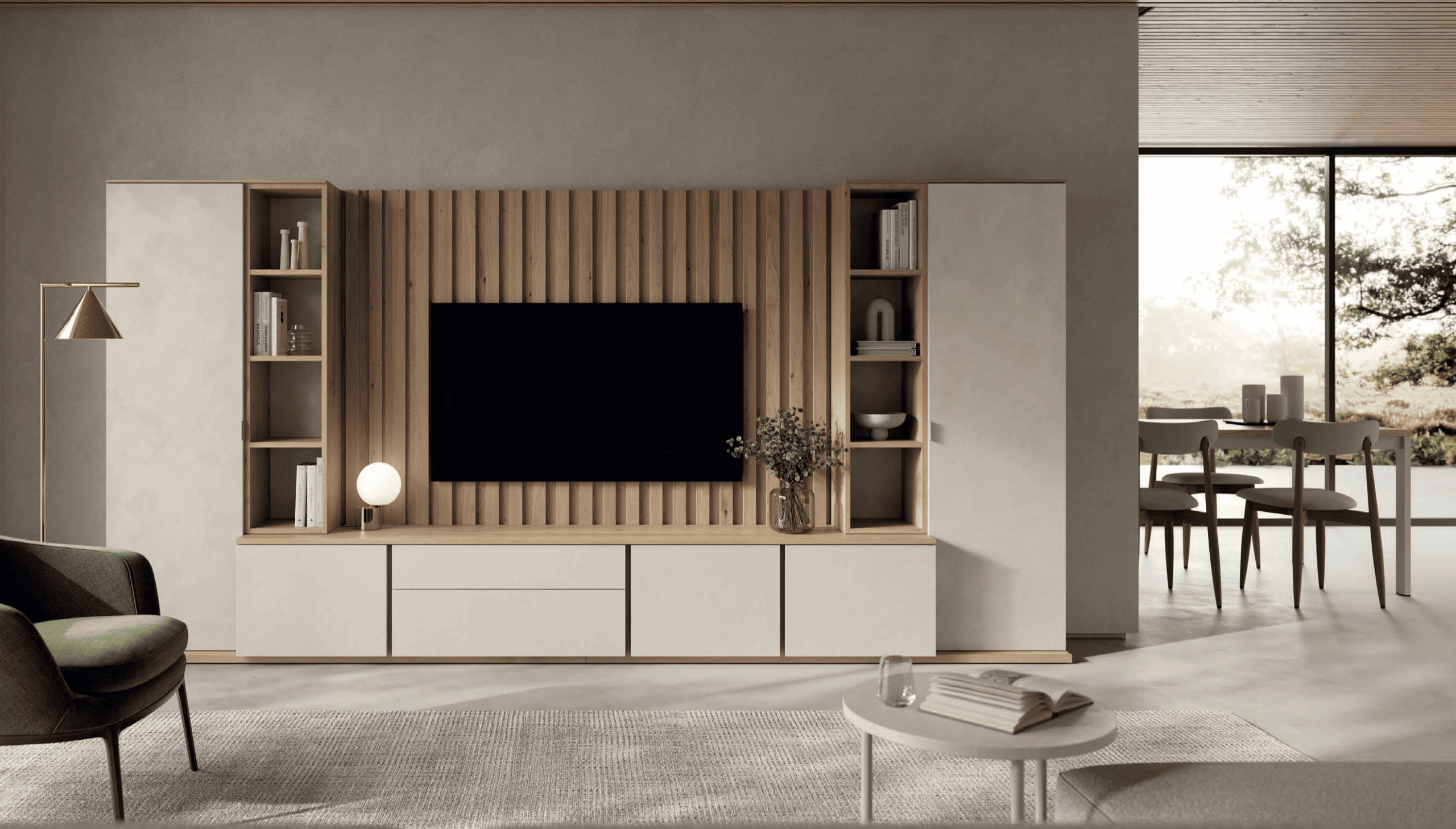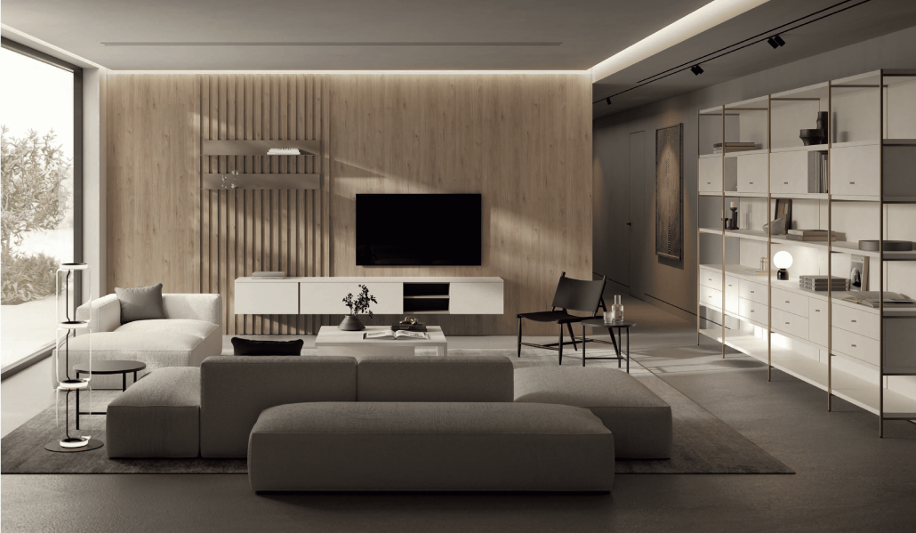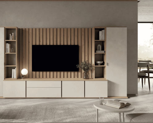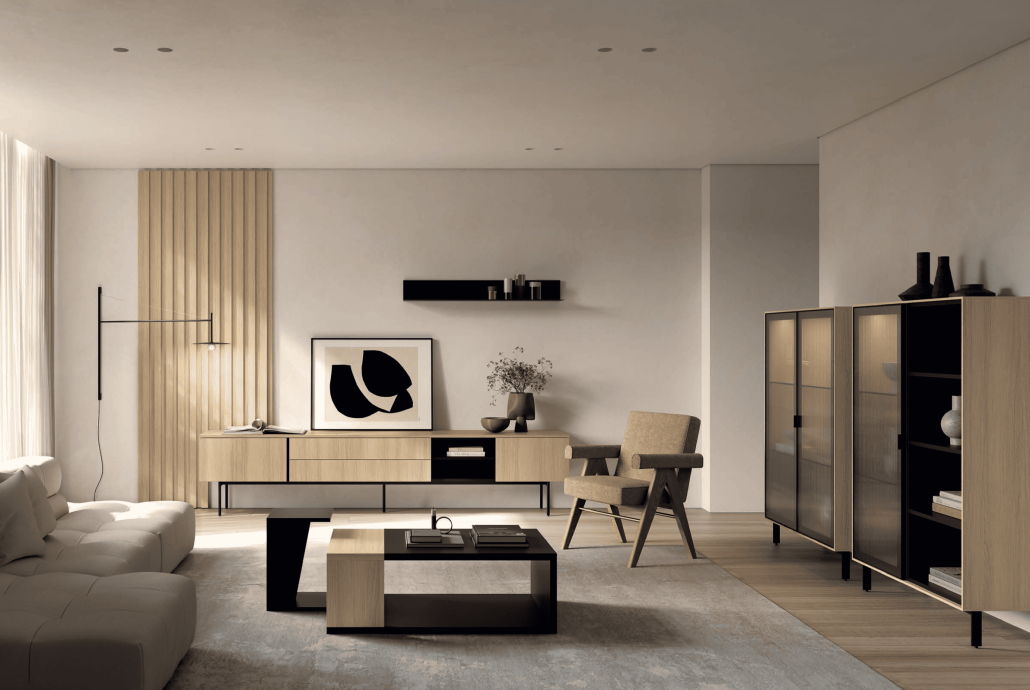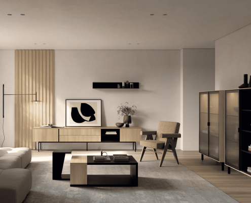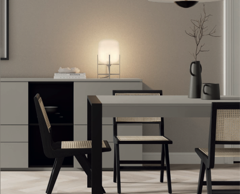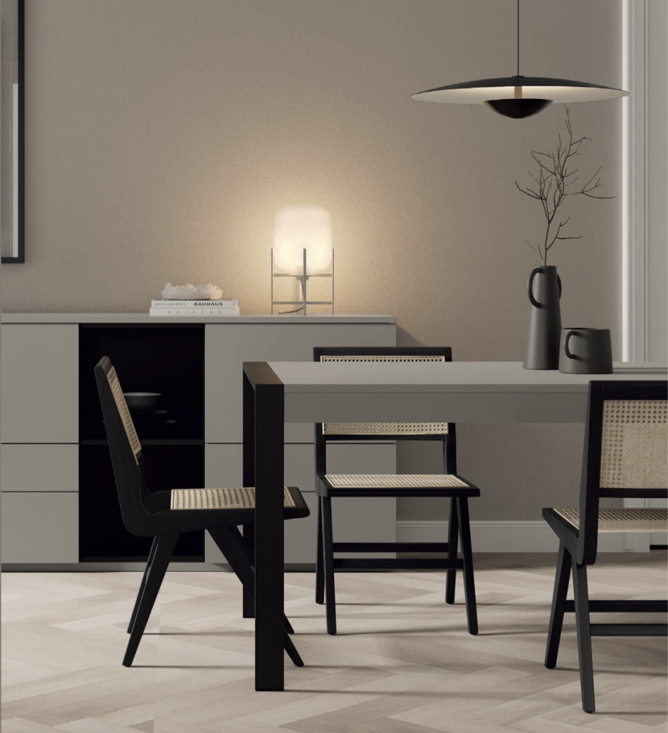 El menjador MUSS 06 combina estil modern i practicitat amb una estètica sofisticada. A més, els seus volums definits i la cura pels detalls creen un ambient acollidor i actual. Per això, és ideal per a qui busca un espai funcional sense renunciar al disseny i a la personalització.